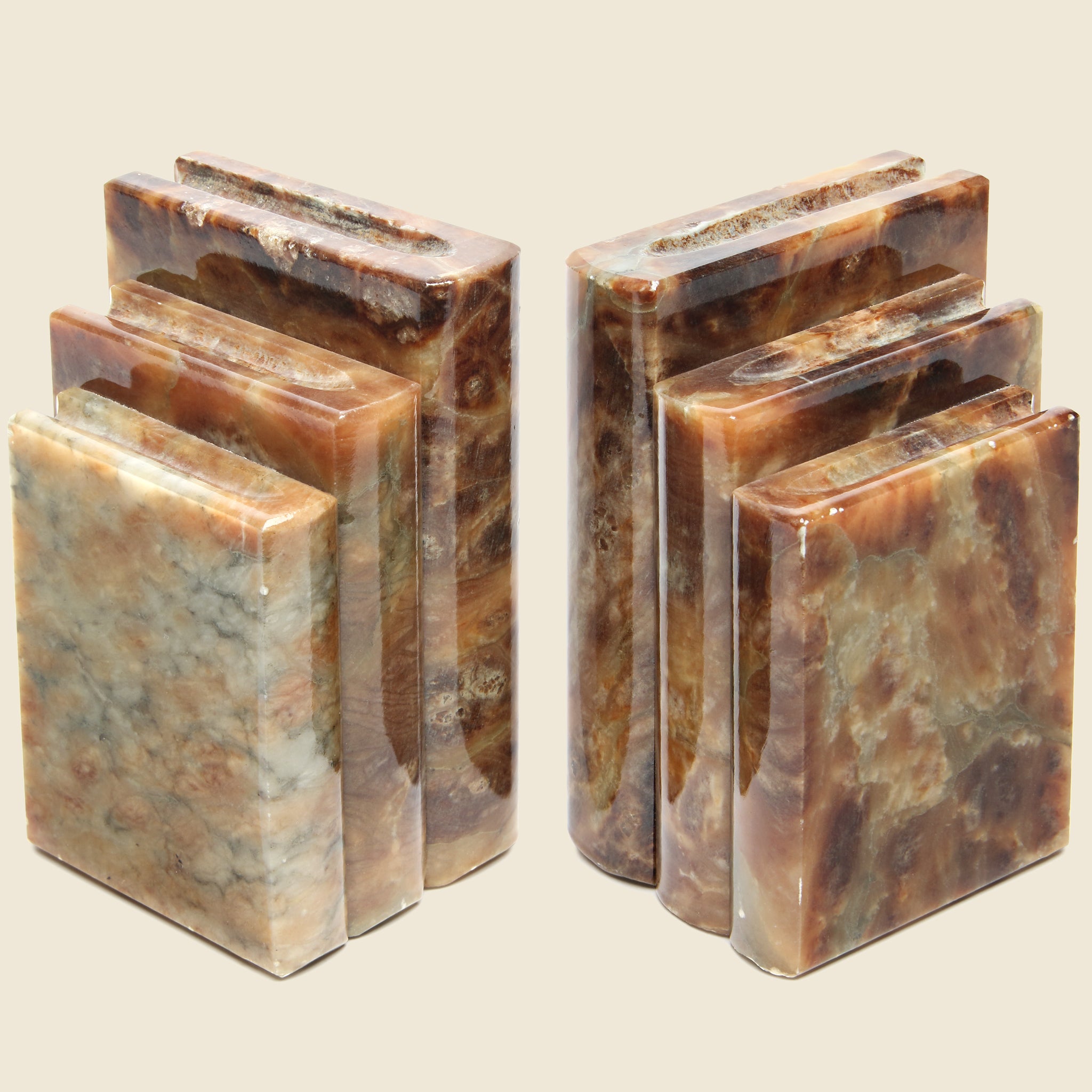This Pair of Vintage Bookends are made with an artful stacked book design that was hand-carved from solid alabaster that features beautiful striations and inclusions that make them truly one of a kind. Wear is consistent with age, and their substantial weight ensures they’re up to the task of propping up your records or favorite novels.