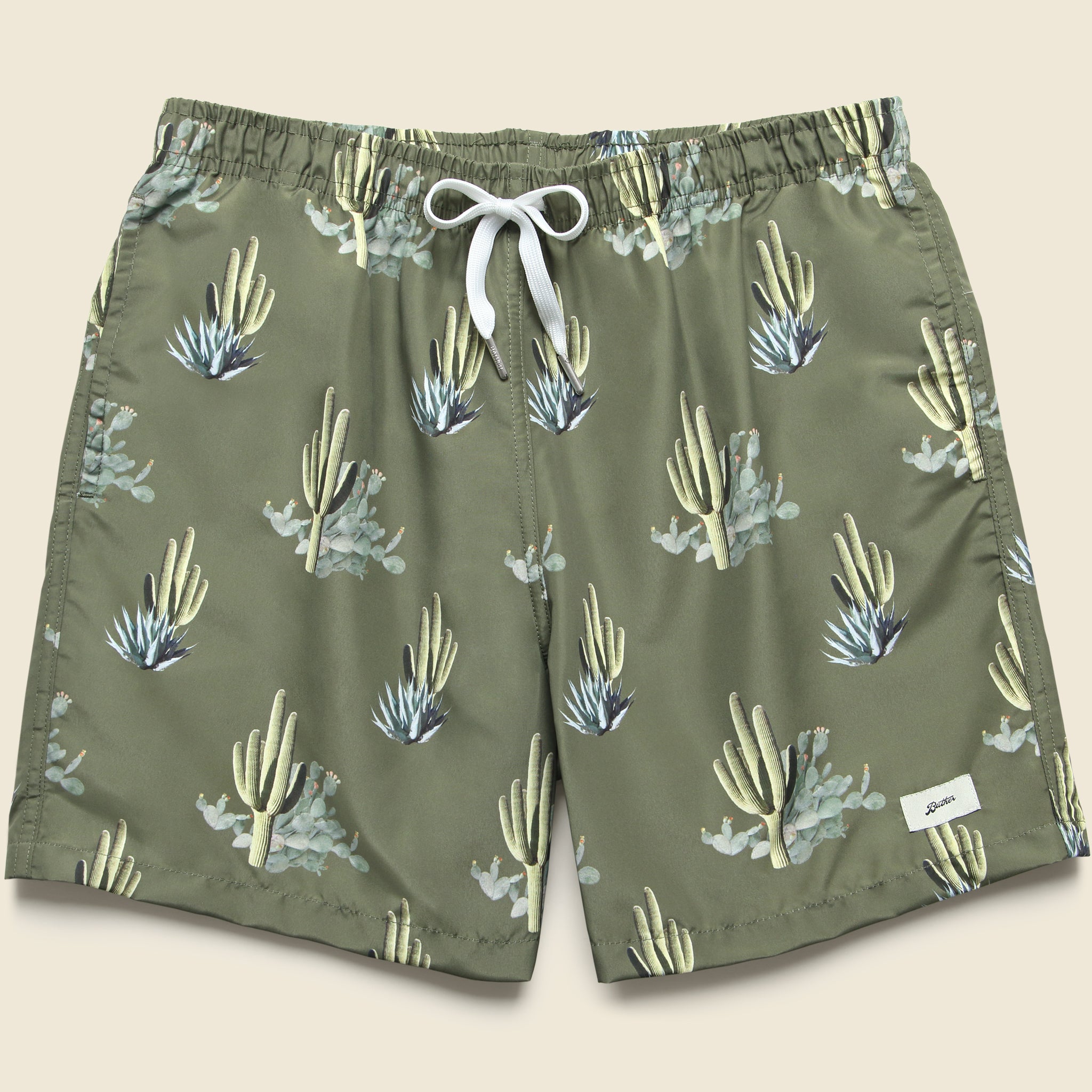 Bather’s swim trunks are made from quick-drying polyester for easygoing comfort in and out of the water. This pair’s been printed with a saguaro cactus pattern and detailed with an elasticized waist with an ultra-fine, four-way stretch mesh lining that’s so soft and comfy, you’ll almost forget it’s there. Finished with two front pockets, custom-tipped drawstrings, and a back pocket with snap closure, these trunks are a summer essential.