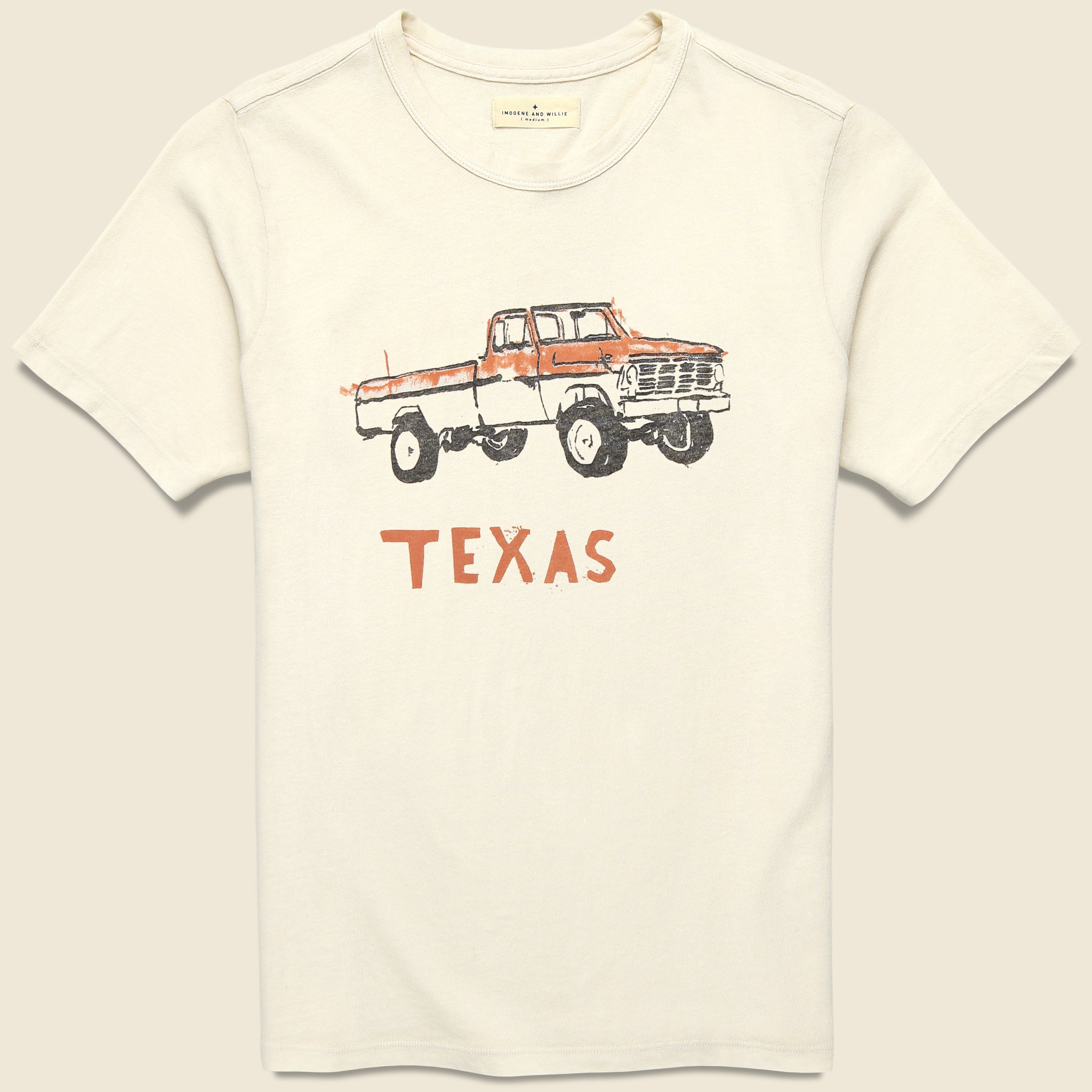 This STAG Exclusive Texas Truck Tee from Imogene + Willie is patterned, cut, sewn, and screen printed here in the USA on soft, American-grown midweight cotton. Garment-washed and preshrunk to feel like your favorite vintage tee, they run a little on the smaller side, so we recommend taking one size up from your normal size.