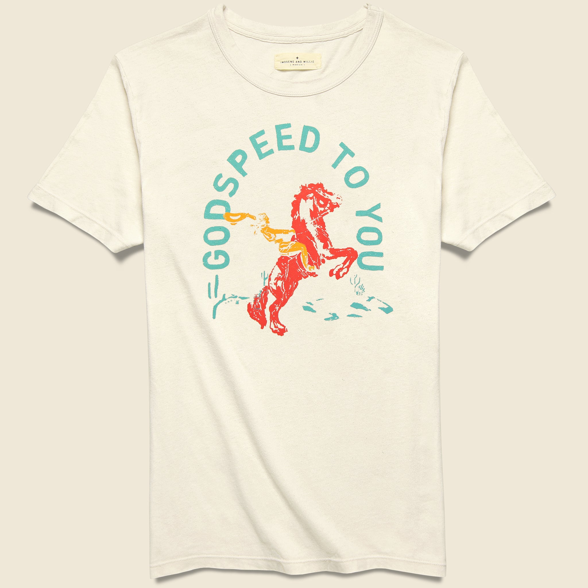The Godspeed Tee from Imogene + Willie is patterned, cut, sewn, and screen printed here in the USA on soft, American-grown midweight cotton. Garment-washed and preshrunk to feel like your favorite vintage tee, they run a little on the smaller side, so we recommend taking one size up from your normal size.