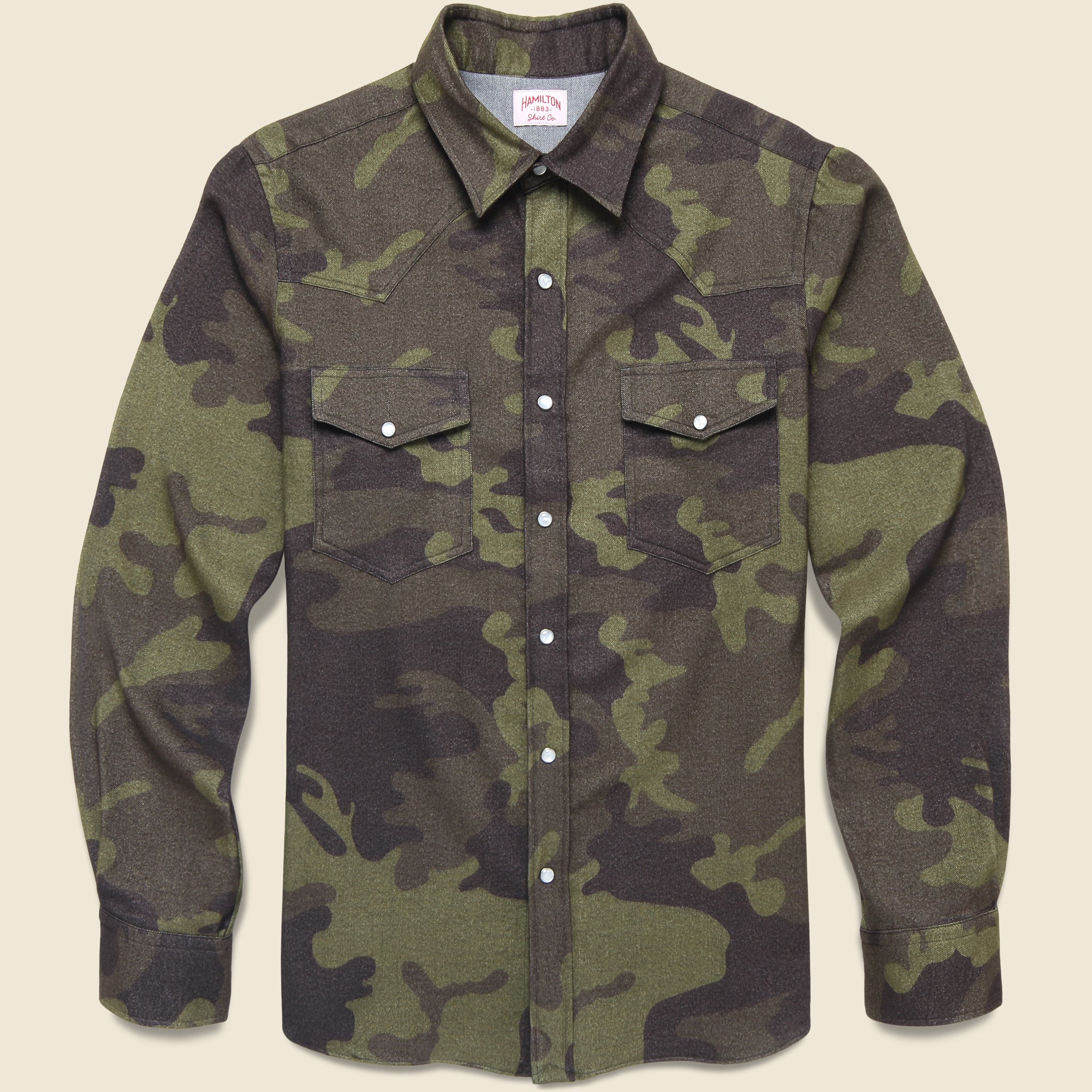 This Western Shirt from Hamilton Shirt Co. is made from lightweight cotton herringbone that’s been printed with an allover woodland camo pattern to add a little dimension to your look. It’s tailored with a traditional western fit that runs truw to size and comes detailed with a pair of snapped chest pockets, classic western-style yoke, and a full-front pearl snap placket to finish it off. Hand cut and sewn in Houston, TX.