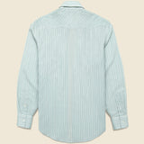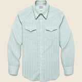 The Slim Fit Cowpoke Western Shirt from Double RL is made from lightweight cotton that’s printed with an Art-Deco-inspired striped pattern. It’s tailored with a slim fit through the chest and shoulder and detailed with western-style yokes and pockets, long sleeves with buttoned barrel cuffs, and a genuine mother-of-pearl button placket.