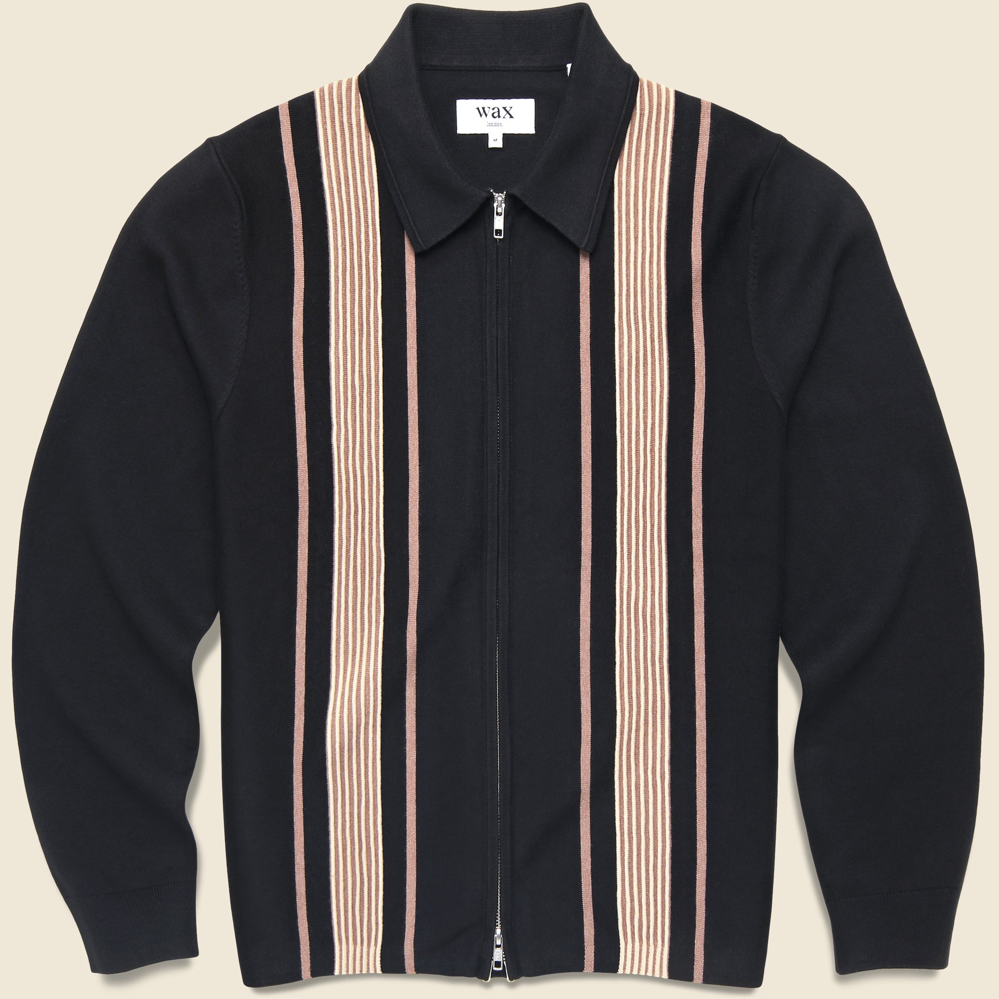 The Lennox Polo from Wax London is made with an incredibly soft cotton-cashmere blend and features a raised tan and cream knitted stripe pattern for a retro-inspired look. It’s tailored with a relaxed fit that makes it easy to layer with and comes detailed with a two-way zipped placket, a squared hemline, and a spread collar to top it off.