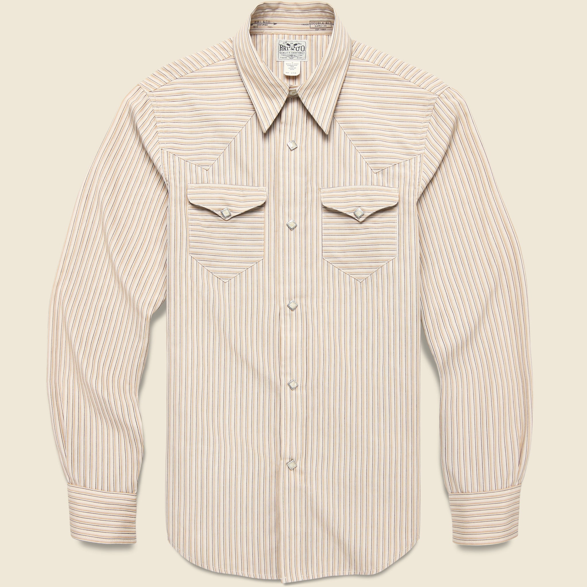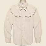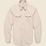 The Slim Fit Phoenix Western Shirt from Double RL is made from lightweight cotton that’s detailed with a yarn-dyed striped pattern that’s inspired by vintage western styles. It’s tailored with a slim fit through the chest and shoulder and detailed with western yokes and pockets, long sleeves with snapped barrel cuffs, and a genuine mother-of-pearl diamond-shaped snapped placket.