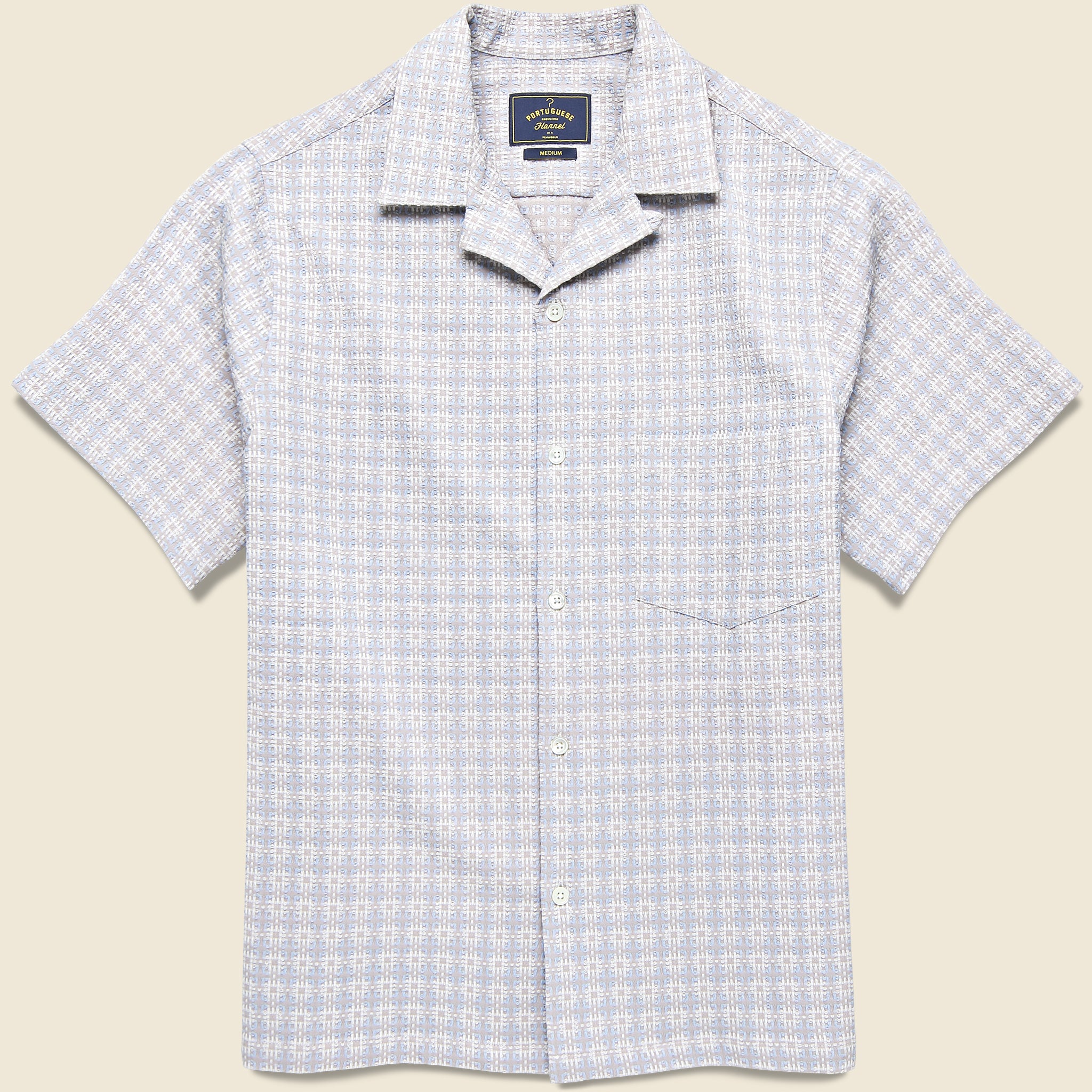 This Polen Camp Shirt from Portuguese Flannel is cut from lightweight, breathable cotton that’s intricately detailed with an embroidered geometric floral pattern. It has a perfectly relaxed, comfortable fit that runs true to size and comes finished with an open camp collar, a single pattern match chest pocket, and a straight hem to complete the vacation shirt look.