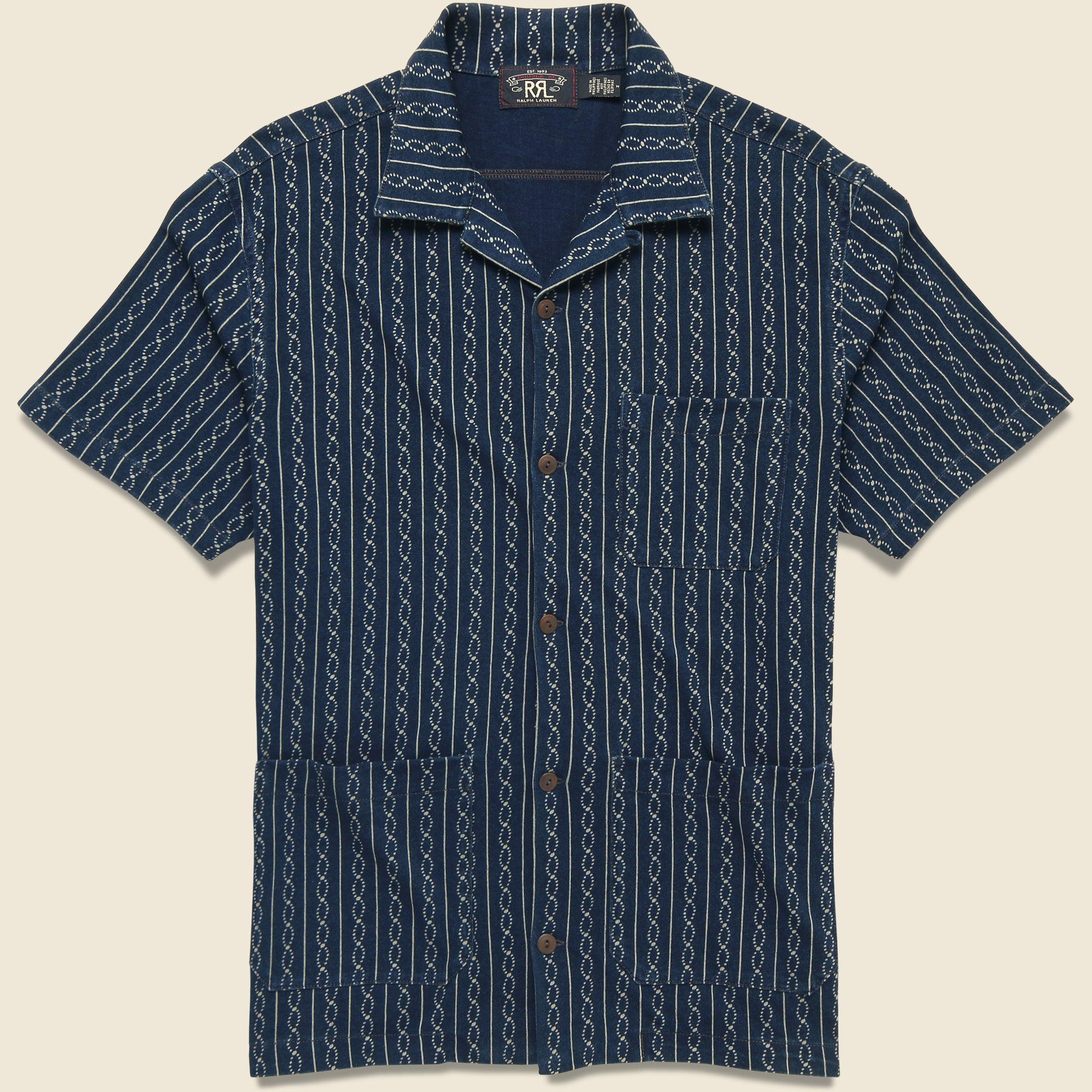 This Jervis Camp Shirt from Double RL is made with a lightweight cotton jersey that’s been dyed with true indigo and discharge-printed with a striped calico motif based on a vintage textile from the RRL archives. It’s tailored with a classic, relaxed vacation shirt silhouette and detailed with a single chest pocket, two waist pockets, corozo buttons, and a classic camp collar to top it off.