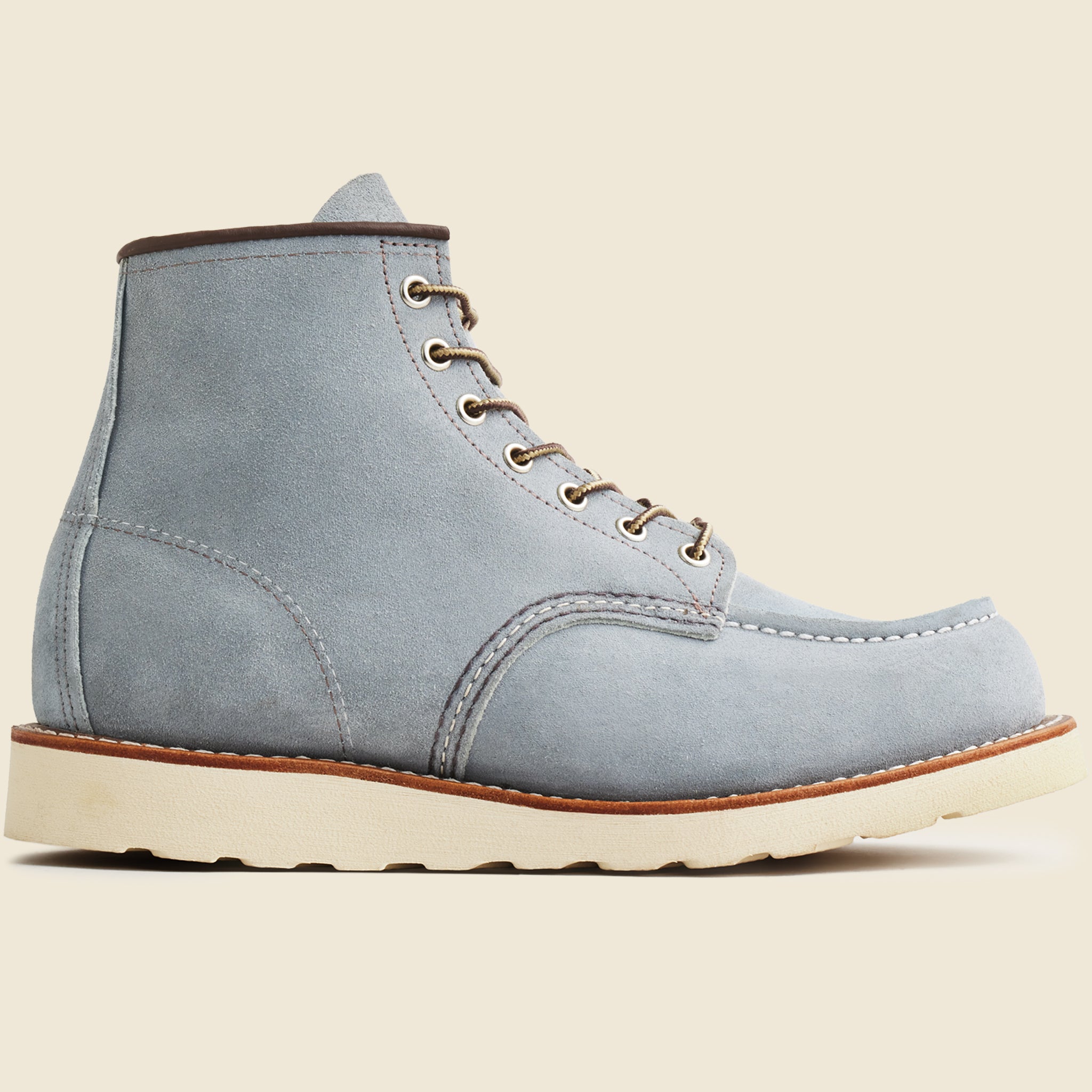 The No. 8800 Moc Toe Boot features the iconic Red Wing Traction Tred outsole, all-around Goodyear welt, and Puritan triple stitching to form a silhouette that has set the standard by which all others are measured. Originally made for sportsmen in the 1950s, these boots quickly grew into a favorite on the farm and in factories due to their long-lasting construction, steady traction, and all-day comfort. Made with the same pride and process today as they were then and constructed with a Dusty Blue Abilene roughout suede leather that’ll break in beautifully through time and wear—this is a pair of boots that might even outlast you.
