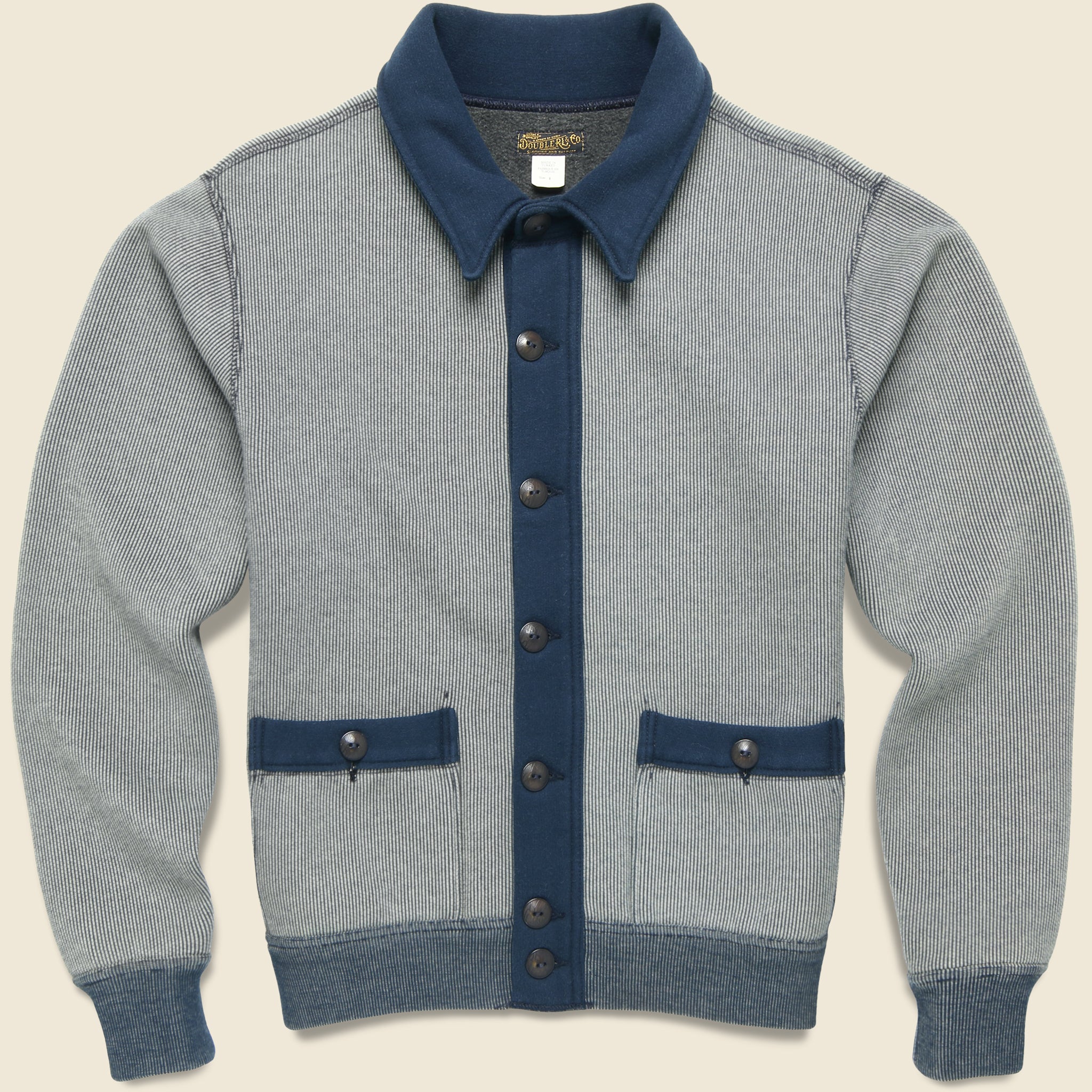 This Collared Cardigan from Double RL is made with a midweight cotton-poly blend that’s jacquard-knit with a subtle striped pattern and a contrasting collar, placket, and pocket trim for a vintage-inspired finish. It’s tailored with a relaxed fit that runs true to size and is detailed with two front waist pockets, corozo buttons, a ribbed hem and cuffs, and a spread collar to top it off.