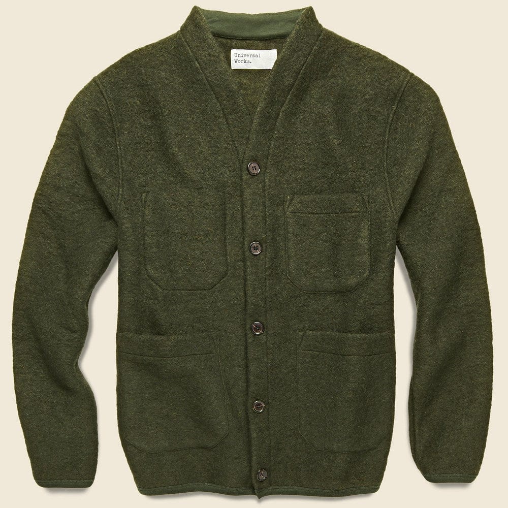 A cold-weather, Chore cardigan with simple, workwear-inspired details like internal and external patch pockets, a short boxy fit, a high collar, and a five-button front. Made with a durable medium-weight melange wool fleece for softness and warmth and featuring tonal soft cotton-trimmed cuffs and hem.