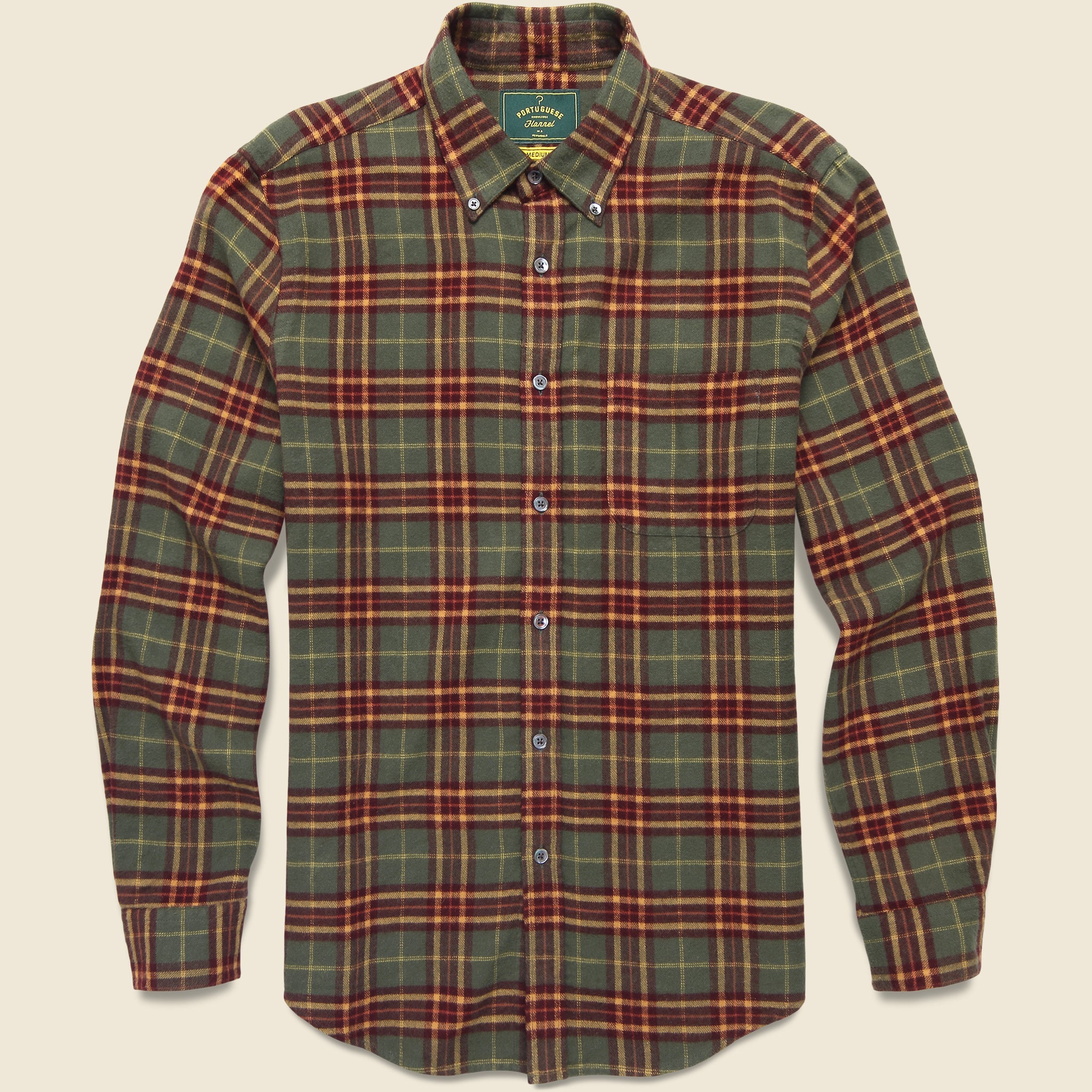 The Hoop Shirt from Portuguese Flannel is made with soft, midweight cotton flannel that’s been lightly brushed and woven with a classic green plaid pattern perfect for cooler weather. It’s tailored with a traditional fit that runs true to size and comes detailed with a single chest pocket, a classic mother-of-pearl button placket, and an Oxford collar for a refined finish.