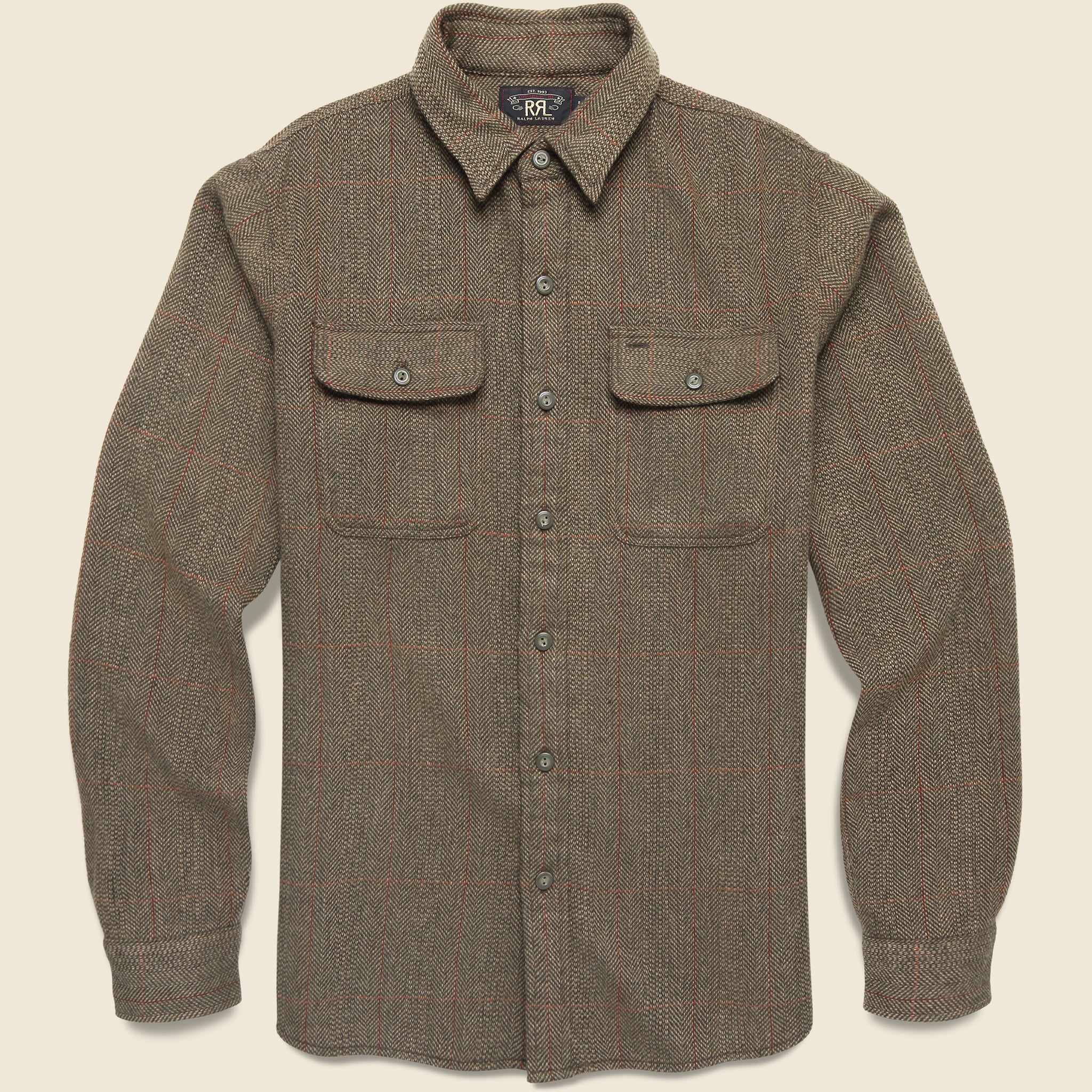 The Grayson Workshirt from Double RL is made with a midweight, yarn-dyed cotton herringbone fabric that has a loose, low-tension weave to give it a tweed-like feel. It has a relaxed, slightly oversized fit that’s cut a touch wider through the chest and shoulder for easy layering and comes detailed with two buttoned chest pockets, a buttoned placket, and suede elbow patches for a vintage-inspired finish.