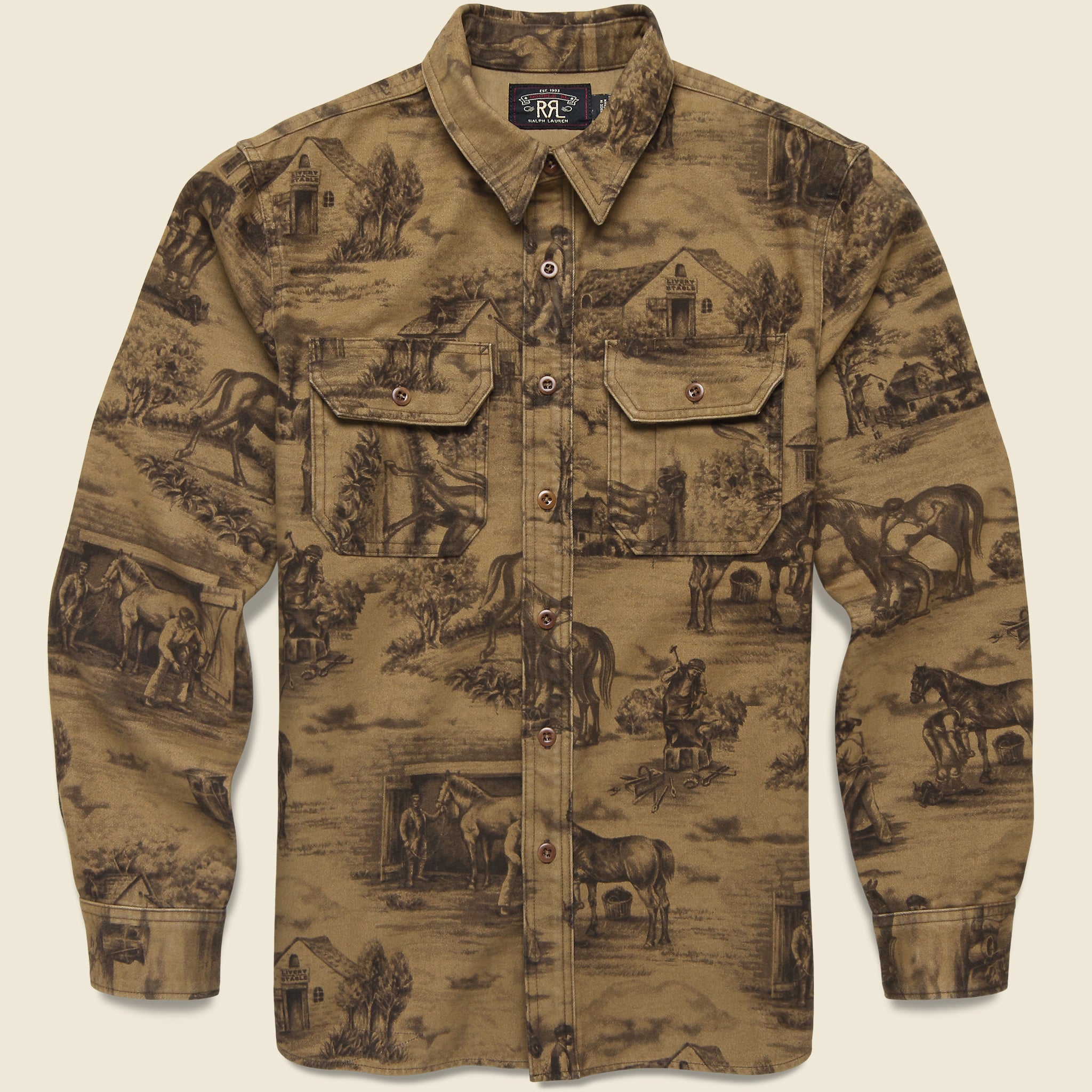 This Sport Shirt from Double RL is made with soft, brushed cotton moleskin that’s been printed with an antique equestrian-inspired toile motif and washed for a vintage look and feel. It’s tailored with a traditional-relaxed fit that runs true to size and comes with a pair of chest pockets, a buttoned placket with corozo buttons, and authentic runoff chainstitched construction at the side seams, which is based on workshirts from the ‘20s & ‘30s.