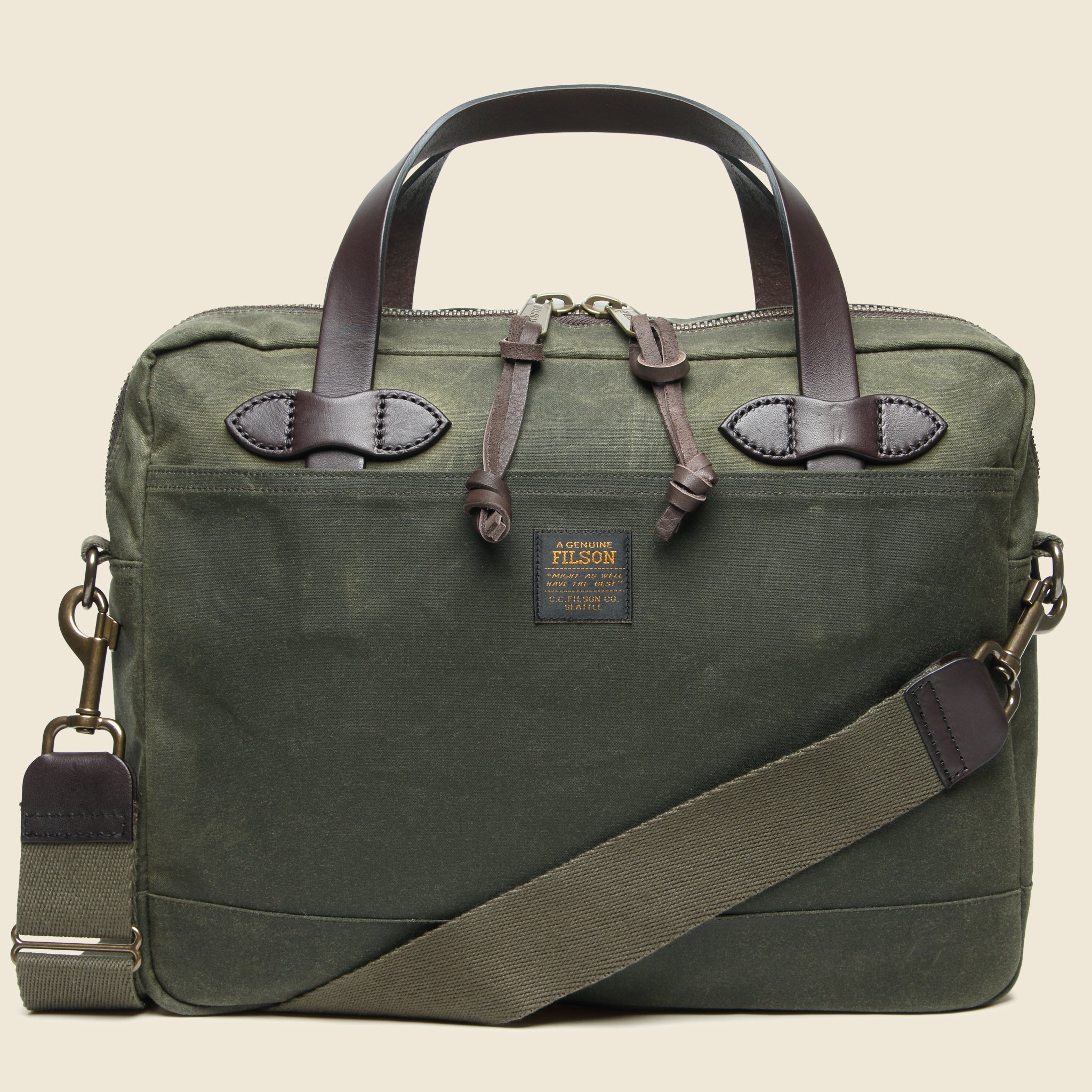 The Tin Cloth Compact Briefcase from Filson is made from durable, weather-resistant waxed canvas produced by the leaders in waxed textile production, British Millerain to provide decades of protection from the elements. Its padded laptop sleeve fits any laptop or tablet up to 15” and the front stow pocket extends the full width of the briefcase to carry any essential documents or cables needed to make light work of any task.