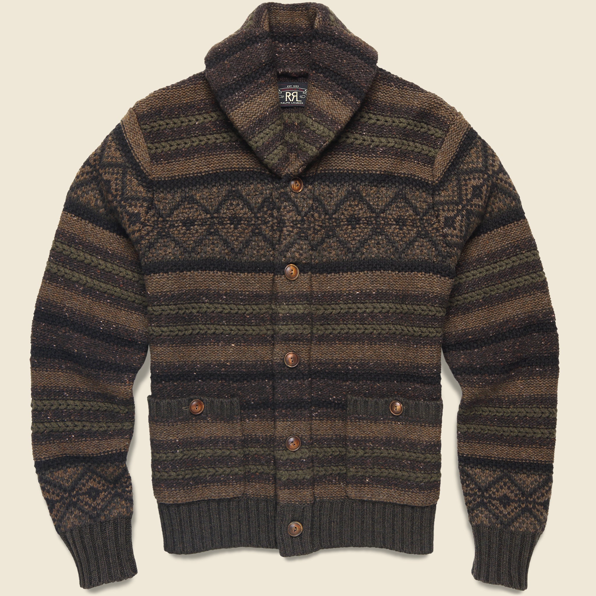 This Shawl Cardigan from Double RL is made with thick-gauge wool and cotton yarns that come together to create a geometric Fair Isle pattern inspired by an equestrian blanket from the 1940s. It has a traditional-relaxed fit that runs true to size and comes detailed with two lower patch pockets, genuine horn buttons, a ribbed hem and cuffs, and a cozy shawl collar to top it off.