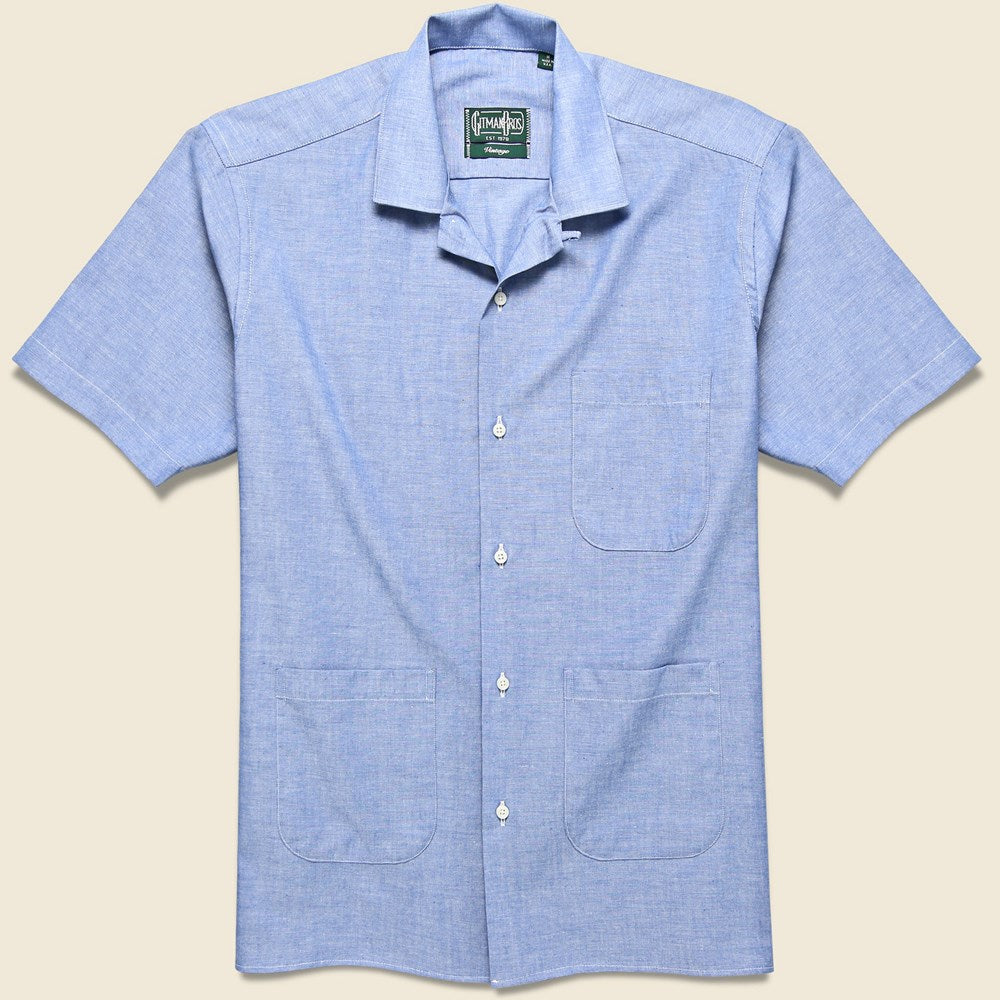 This Chambray Guayabera Shirt from Gitman Vintage is made from a breathable, 100% cotton chambray and tailored with a classic guayabera style. Cut a little loose through the chest for easy layering, and detailed with four front pockets, this shirt is essential for summer and finished with a straight hem, short sleeves, and a classic camp collar to top it off.