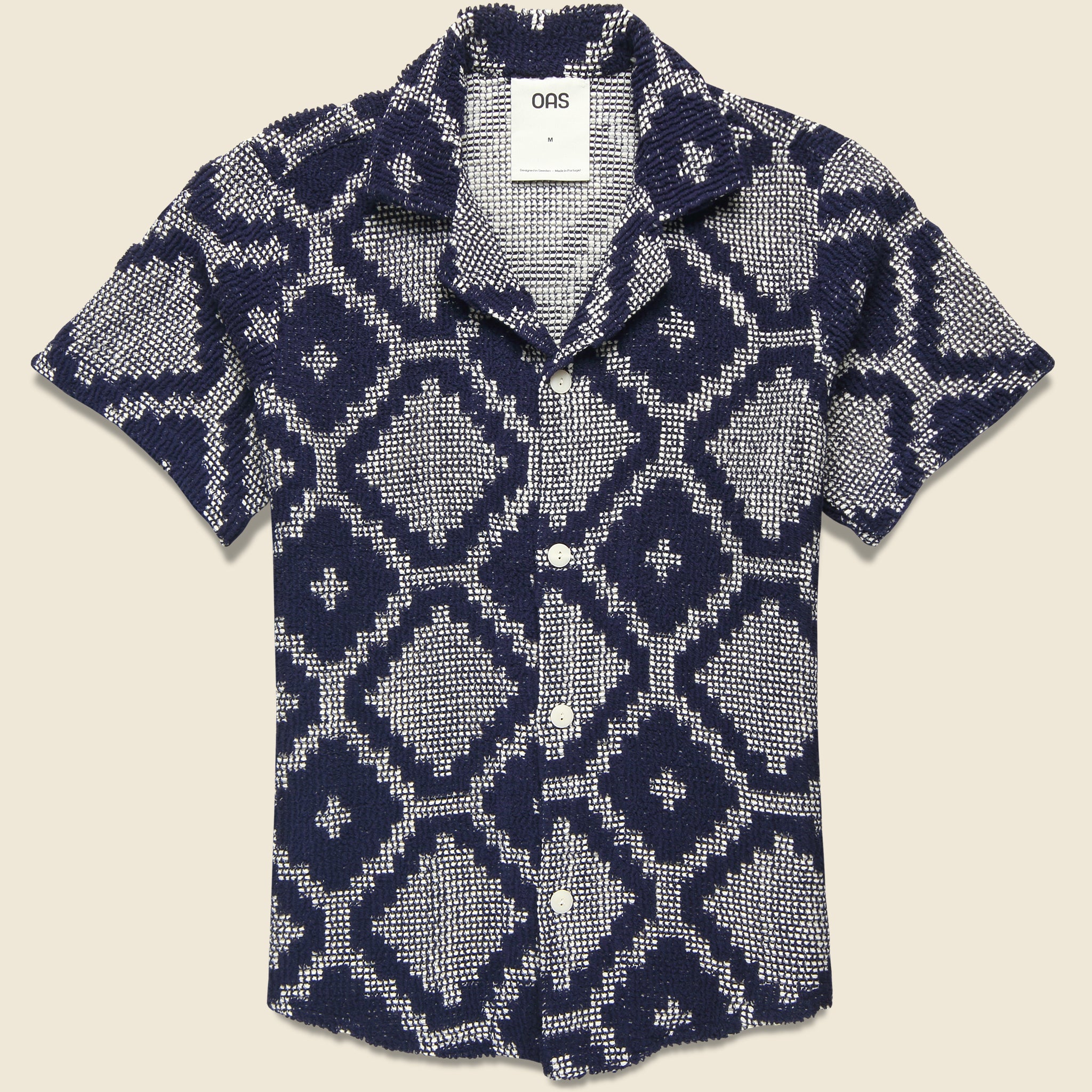 This Crochet Terry Shirt from OAS is made with a soft, midweight cotton-poly blend that’s woven with a two-toned, textured jacquard pattern inspired by classic mosaic motifs. It’s tailored with a traditional fit that runs true to size and comes with a simple, four-button placket, an open camp collar, and a slightly curved hem to round things out.