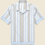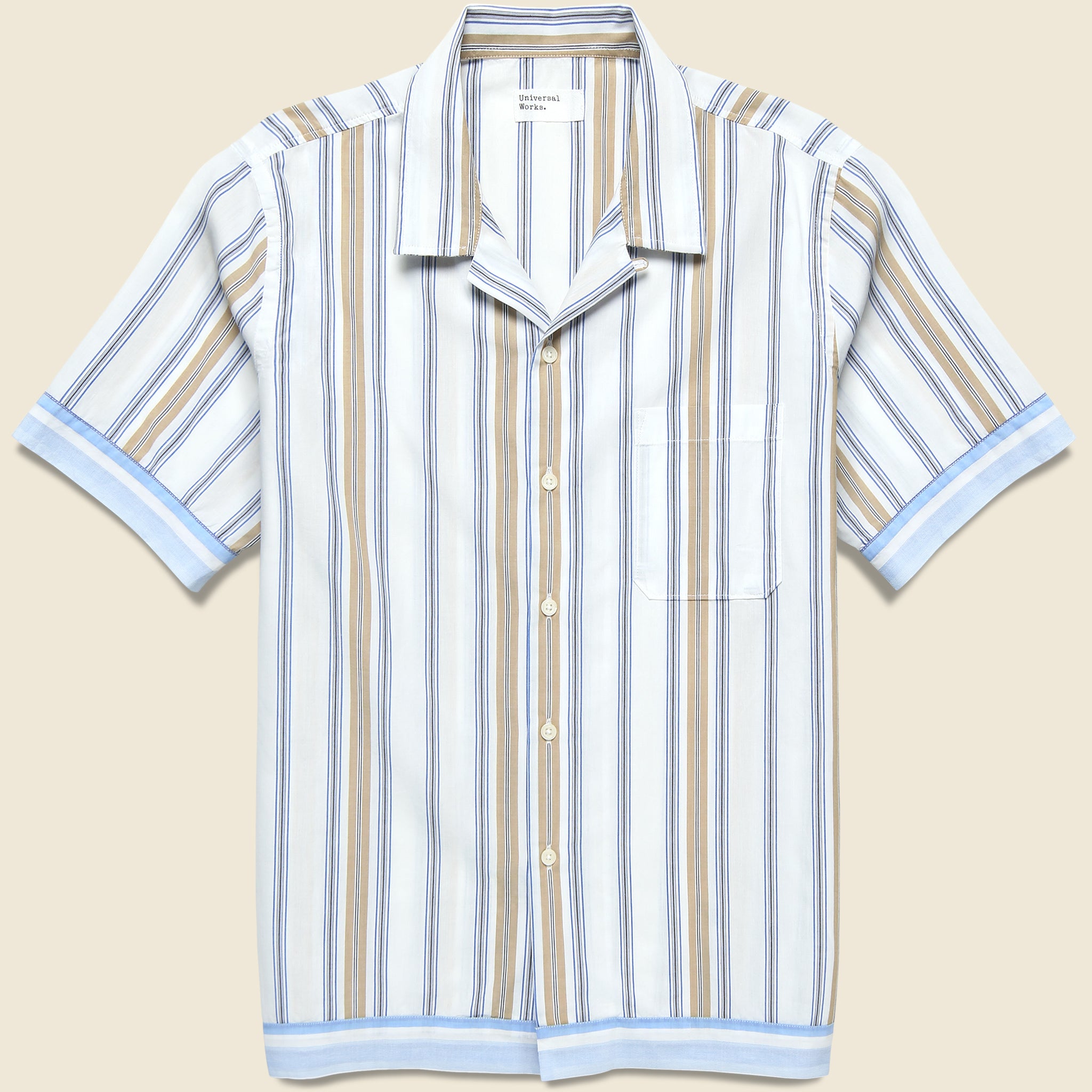 The Dean Stripe Road Shirt from Universal Works is made with lightweight, breezy cotton that’s woven with a classic vertical striped pattern and accented with contrast trim at the cuffs and hem for a vintage-inspired finish. It’s tailored with a traditional fit that runs a touch slim through the shoulder and is detailed with a single, pattern-match chest pocket, mother-of-pearl buttons, and a camp collar for a laid-back 50s look and feel.