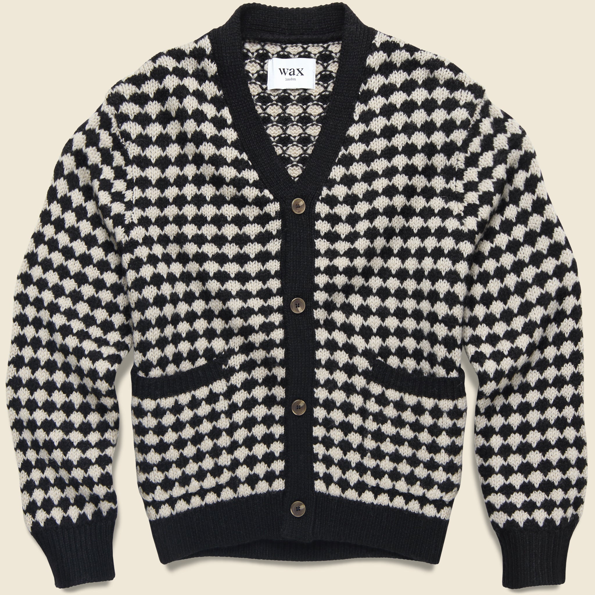 The Walker Cardigan from Wax London is crafted from a warm wool blend that’s knit with a retro-inspired geometric diamond jacquard pattern to add a little dimension to your winter wardrobe. It’s tailored with a relaxed, easygoing fit that runs true to size and comes detailed with a pair of handwarmer pockets and a simple four-button placket for a classic finish.