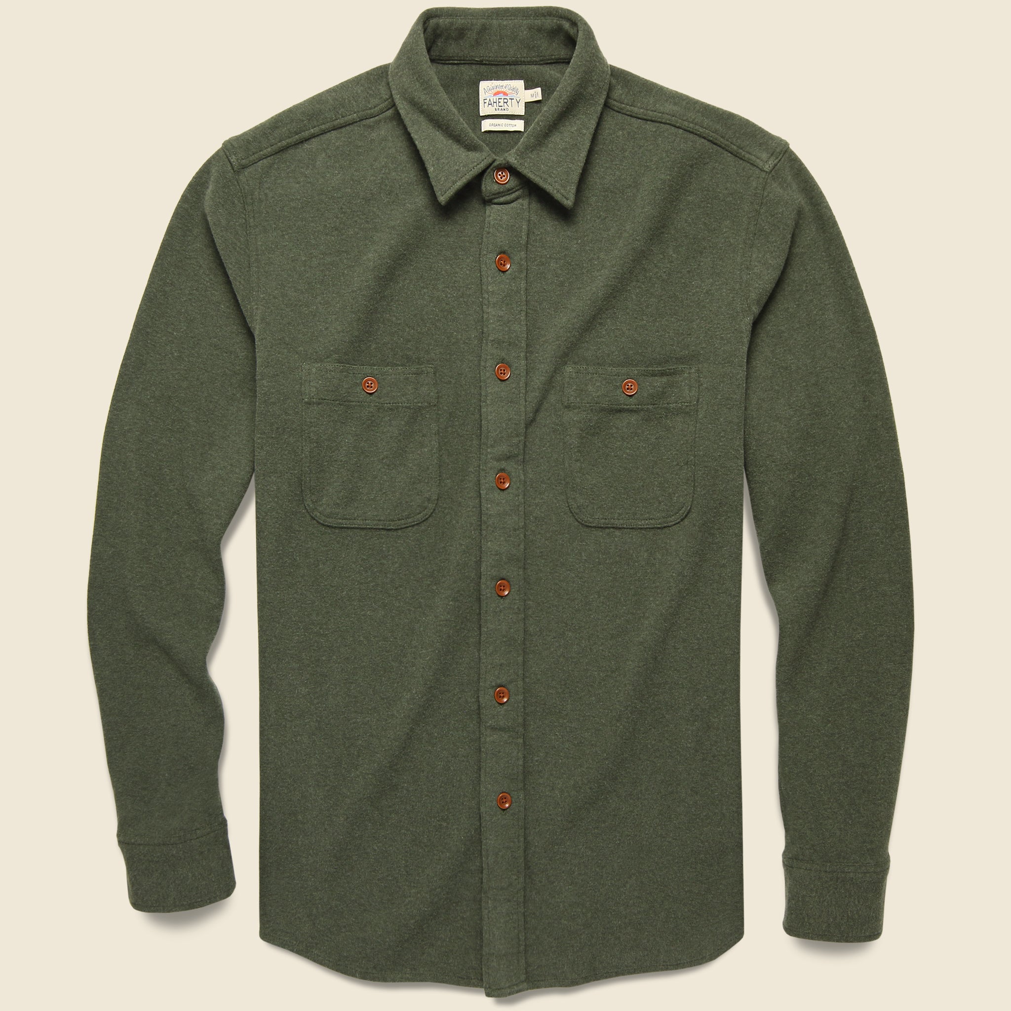 Faherty took their popular Brushed Alpine Flannel shirt and gave it a few upgrades. Made from a special organic cotton blend knit fabric with flecked yarns that give it a nice heathered texture, it comes with workwear-inspired topstitching and the right amount of stretch to keep you moving. Finished with a Corozo button placket, double button sleeve cuff closure, and two button-through chest pockets.