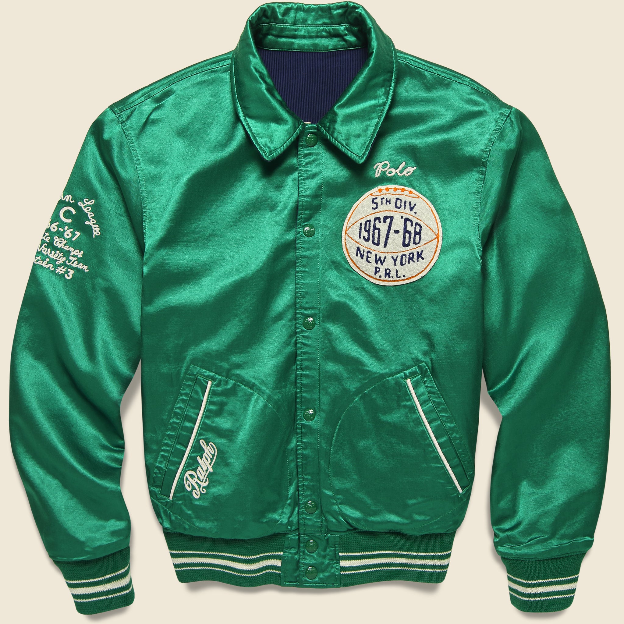 This Varsity Bomber Jacket from Polo comes fully reversible and flips from soft, washed corduroy to sleek satin to reveal athletic-inspired graphics on each side. It has a perfectly relaxed fit that’s detailed with hand pockets at both sides, tonal striped ribbing, painted brass snaps, and a point collar to top it off.