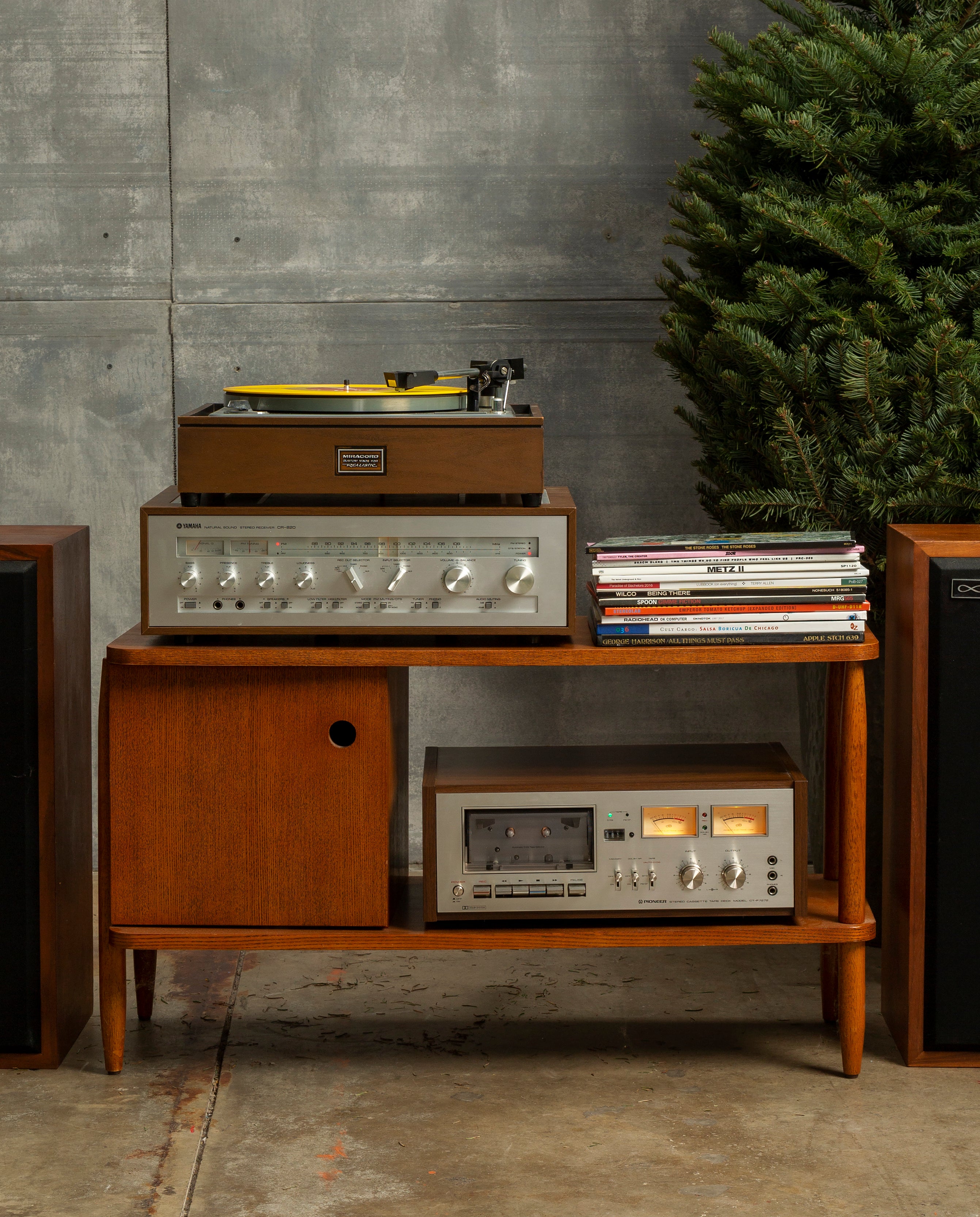 This vintage 1970's system features an Elac Miracord 40A fully automatic turntable, a Yamaha CR-820 amplifier, a Pioneer CT-F7272 casette deck, and a pair of Infinity 1001A speakers. Driven by a traditional idler-wheel, the streamlined Elac turntable was designed & manufactured in West Germany & incorporates push button functionality so you can play records at 16, 33, 45 or 78 rpms. The Yamaha CR-820 amplifier features clean knobs and oversized rectangular switches & drives a pair of Infinity 1001A’s -- the increasingly rare speakers that High Fidelity magazine raved "can handle the most demanding orchestral material with ease." And because tapes are making a comeback, this hi-fidelity system even includes a pristine Pioneer CT-F7272 stereo cassette deck.