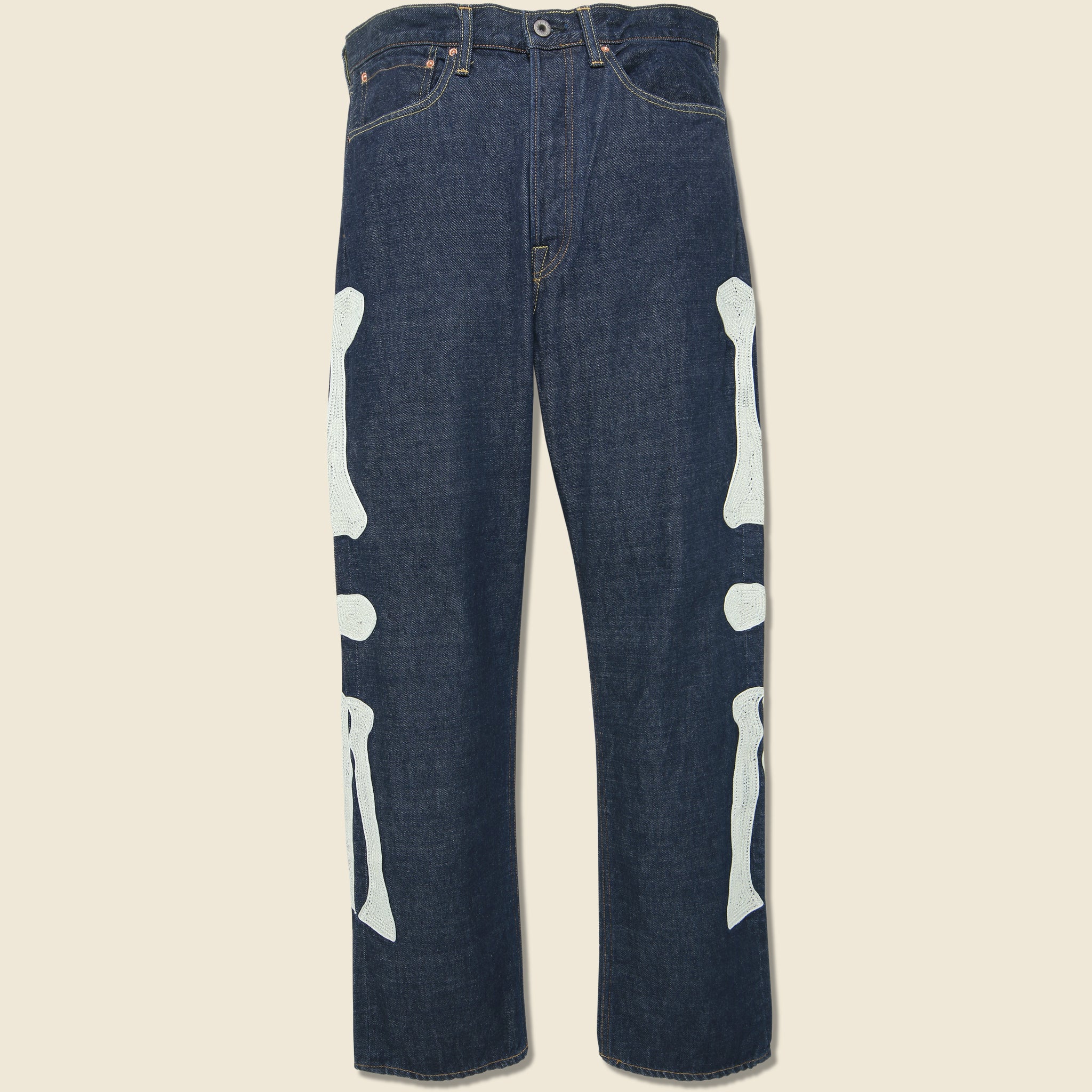 The Denim Mexican Tuxedo 5P Okagilly is cut from soft yet sturdy 12.5oz Japanese denim and embroidered with Kapital’s signature skeleton bones down the sides a subtle spookiness to every step. Dyed with natural indigo and tailored with a regular tapered fit, this pair of denim has a classic 5-pocket construction and comes finished with a leather debossed Kapital patch and a back cinch for a custom fit.