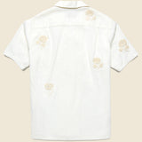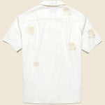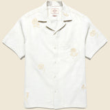 The Embroidered Ramie Camp Shirt from Portuguese Flannel is made from a soft and breezy, 100% ramie that’s been embroidered with an intricate tonal floral pattern throughout. It’s cut with a boxy, relaxed fit for extra comfort and detailed with a single chest pocket, a simple five-button placket, and a camp collar for a classic finish.