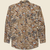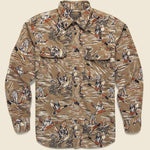 This Field Flannel Workshirt from Filson is cut from a warm mid-weight cotton twill that’s been printed with a brown marsh and mallard pattern for a vintage-inspired look. It’s finished with a military-grade melamine button front closure, adjustable cuffs, a pair of button-flap chest pockets, and a pleated back to give you a full range of movement in the shoulders.
