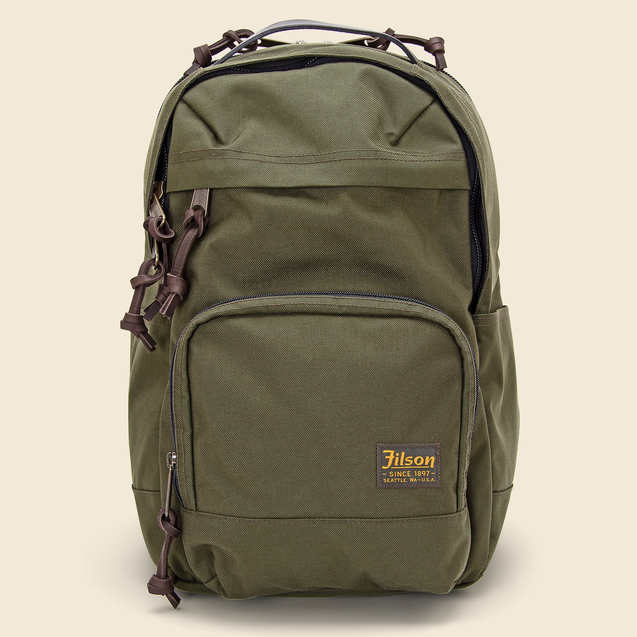 The Filson Dryden Backpack is constructed from 1000-D Cordura nylon, built to withstand the wear and tear of travel and everyday use. Featuring a double-layered reinforced bottom for added durability and a hidden zipper rear padded laptop sleeve to securely and safely stow your tablet or laptop up to 16”. Finished with Bridle Leather and nylon webbing for multiple convenient carrying options and heavy-duty coil zippers to help prevent snagging.