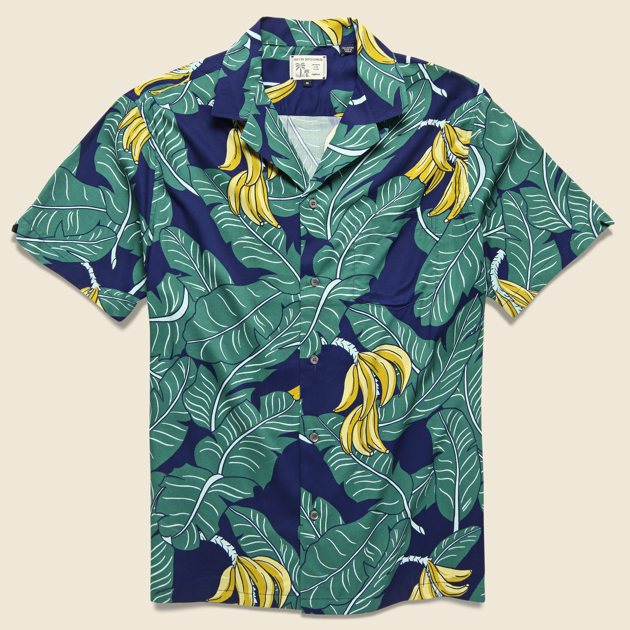 Reyn Spooner has been producing comfortable, island-inspired and well-made beachwear since 1956. This breezy, Bali-inspired Monkey Forest Camp shirt from Reyn Spooner is cut from luxurious Japanese spun rayon. Printed with allover vibrant green banana leaves and bananas against a blue backdrop. Tailored with a camp collar and cut so it can be worn over a tee or on its own. Reyn Spooner classic fit shirts are cut with a little extra room through the chest and body for relaxed comfort look. Finished with handy patch pocket at the chest for your shades.